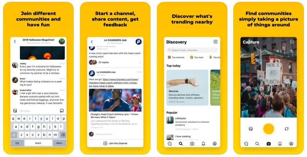 Es un chat para los que aman ponerse frente al teléfono y compartir sus entornos. En esta aplicación, la cámara se dirige al ambiente del usuario y permite encontrar grupos con afinidades temáticas a partir de su localización. La aplicación usa inteligencia Artificial con la que les sugiere a sus usuarios chats y temas, basándose en la ubicación e intereses.